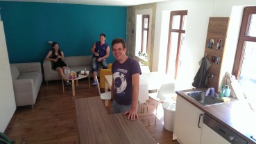 Über ein halbes Jahr hat sich die Renovierung gezogen, obwohl die Jugendlichen sogar „in den Freistunden oder nach der Schule rüberkamen”, erinnert sich Katharina, um „eine Tür abzuschleifen oder die Decke zu streichen”. Insgesamt, schätzt CVJM-Jugendarbeiter Jan Schneider, „waren 40 Personen im Einsatz, auch Erwachsene.” Sein Bruder, von Beruf Tischler, reiste zur Unterstützung sogar aus Baden-Württemberg an. Die Materialkosten, die Miete, sowie das Geld für die Einrichtung, kamen aus mehreren Fördertöpfen, den größten Anteil finanzierte die Aktion Mensch. Vom Küchenbauer abgesehen, dessen Einsatz bezahlt wurde, arbeiteten alle ehrenamtlich. „Dass die Jugendlichen schulisch dermaßen eingespannt sind, war mir vorher nicht so bewusst”, ergänzt der „Hausherr”. Jan Schneider hat auch sein Büro in den „Laden” verlegt, um ansprechbar zu sein.